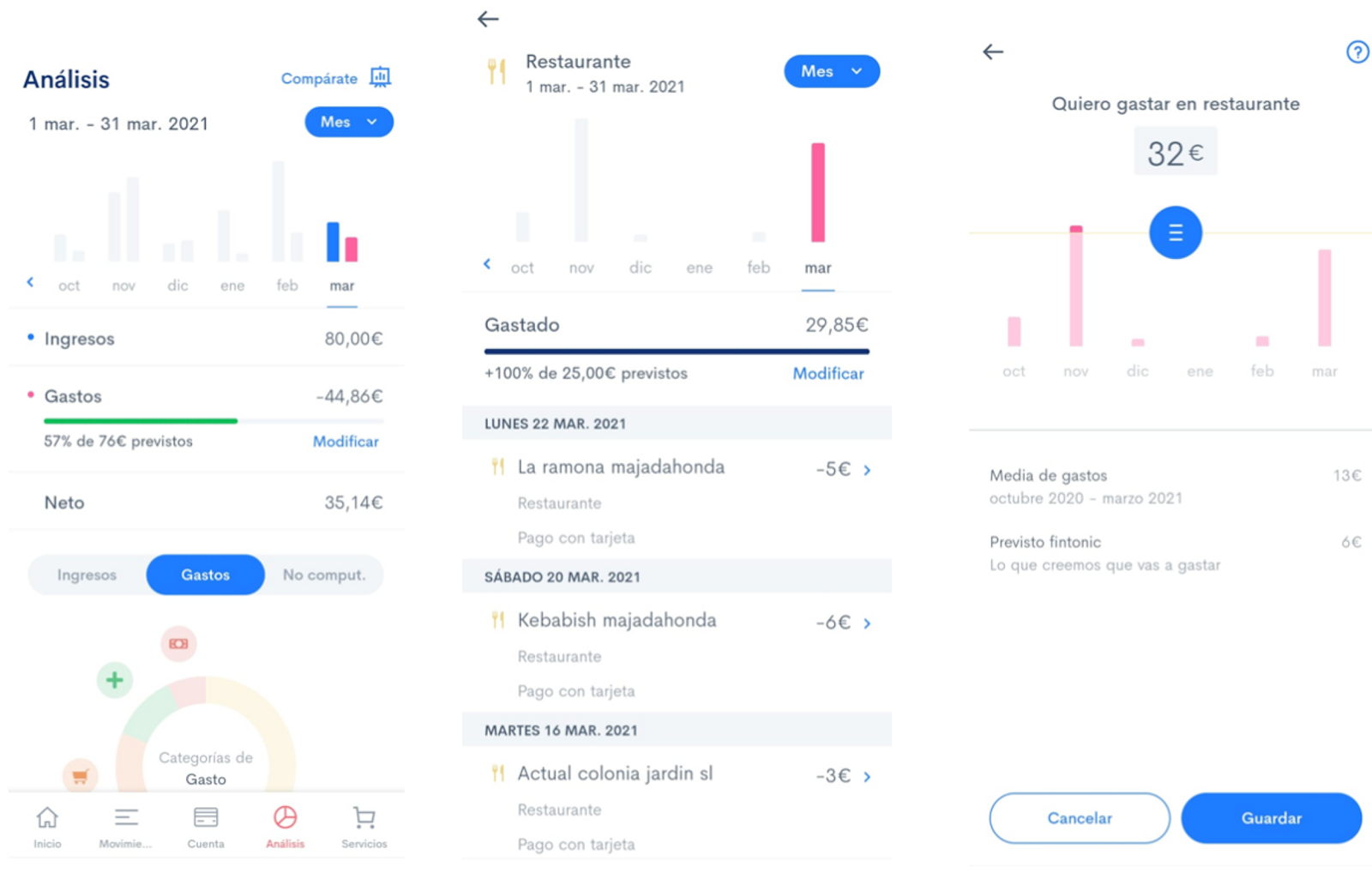 En el menú de navegación, en Análisis haz clic en gastos y selecciona una de las categorías. (Por ejemplo: Restaurante). Aquí podrás ver tus gastos de cada mes en esta categoría. Debajo del gráfico, aparece una barra con el porcentaje gastado de lo que había previsto. Tu previsto está calculado de manera automática basado en tu comportamiento histórico. Puedes cambiar esta previsión y fijarte un presupuesto, para ello haz clic en “Modificar”. Verás un gráfico con los gastos de los meses anteriores, la media de gastos y la previsión de Fintonic para hacerte una idea y poder fijar el presupuesto adecuado. Introduce la cantidad que consideres y dale a “Guardar”.