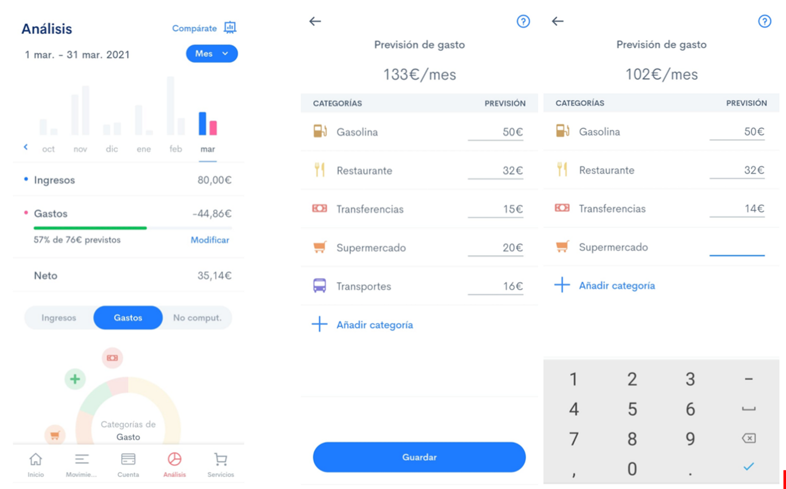 Si prevés un gasto de una categoría que no está incluida en la lista de Previsión de gasto porque tu previsto es 0€, podrás añadirla pinchando en “+ Añadir categoría” y seleccionándola. Una vez se haya añadido a tu lista de gastos, tienes que establecer el importe que crees que vas a gastar para que la previsión sea lo más real/acertada posible.